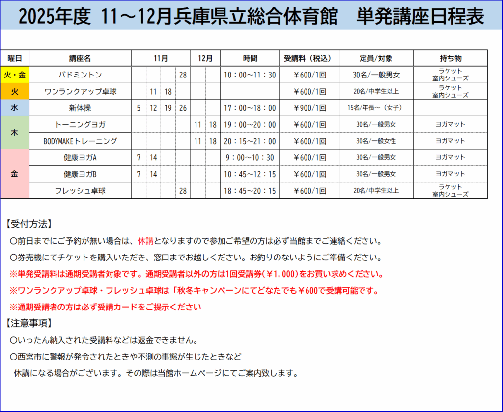 また、「ワンランクアップ卓球(火)」「フレッシュ卓球(金)」は秋冬キャンペーン対象として、